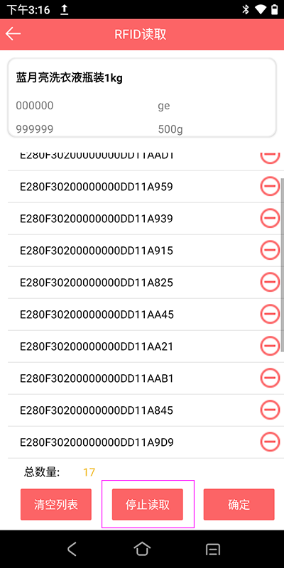 点击“RFID”按钮,进入RFID扫描页面,扫描完成后,点击“停止读数”按钮,如下图所示: