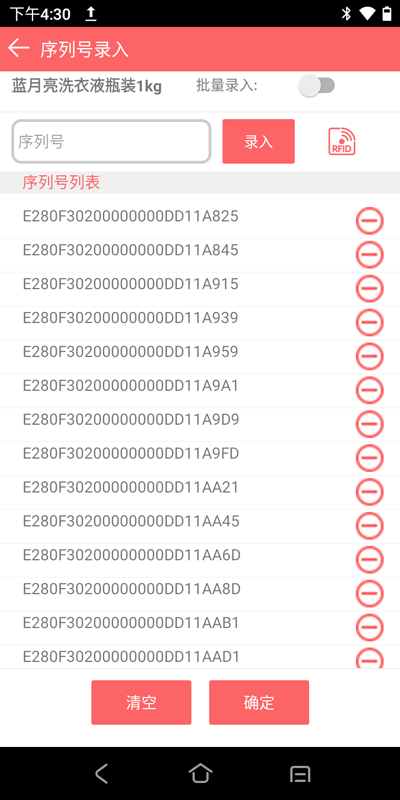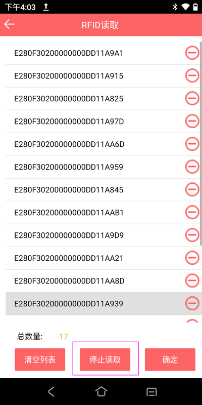 点击“RFID”按钮,进入RFID扫描页面,扫描完成后,点击“停止读数”按钮,如下图所示: