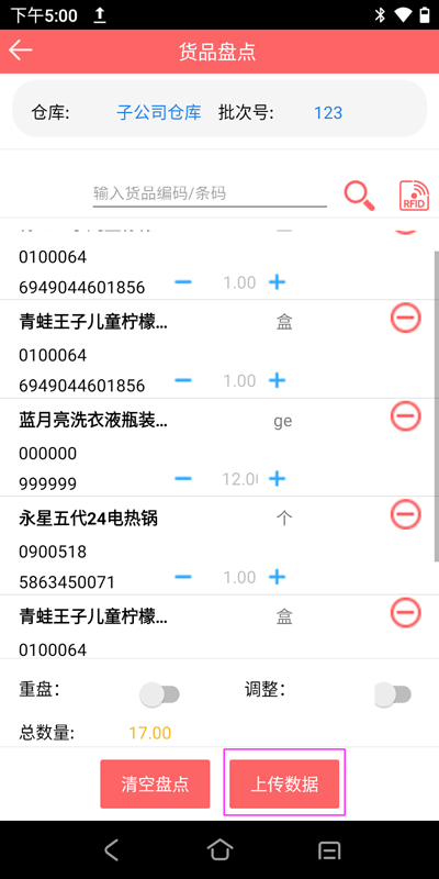 无需一个个货品扫描,一键获取所有RFID码,确认后,自动关联出对应的货品,和扫描到的数量。点击“上传数据”按钮将盘点数量上传,如下图所示: