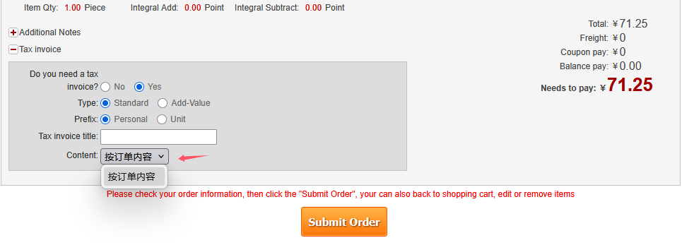 When the "Use Invoice" function is enabled in the website backend, front-end members will select their invoice type from the invoice list above when placing an order.