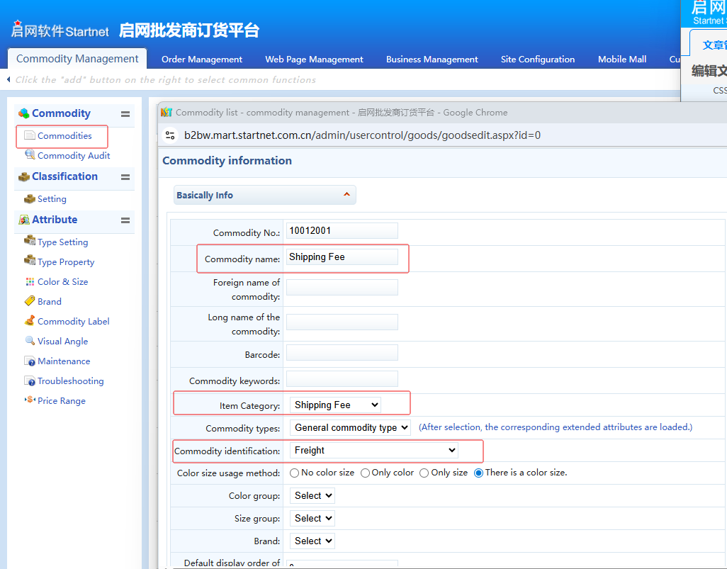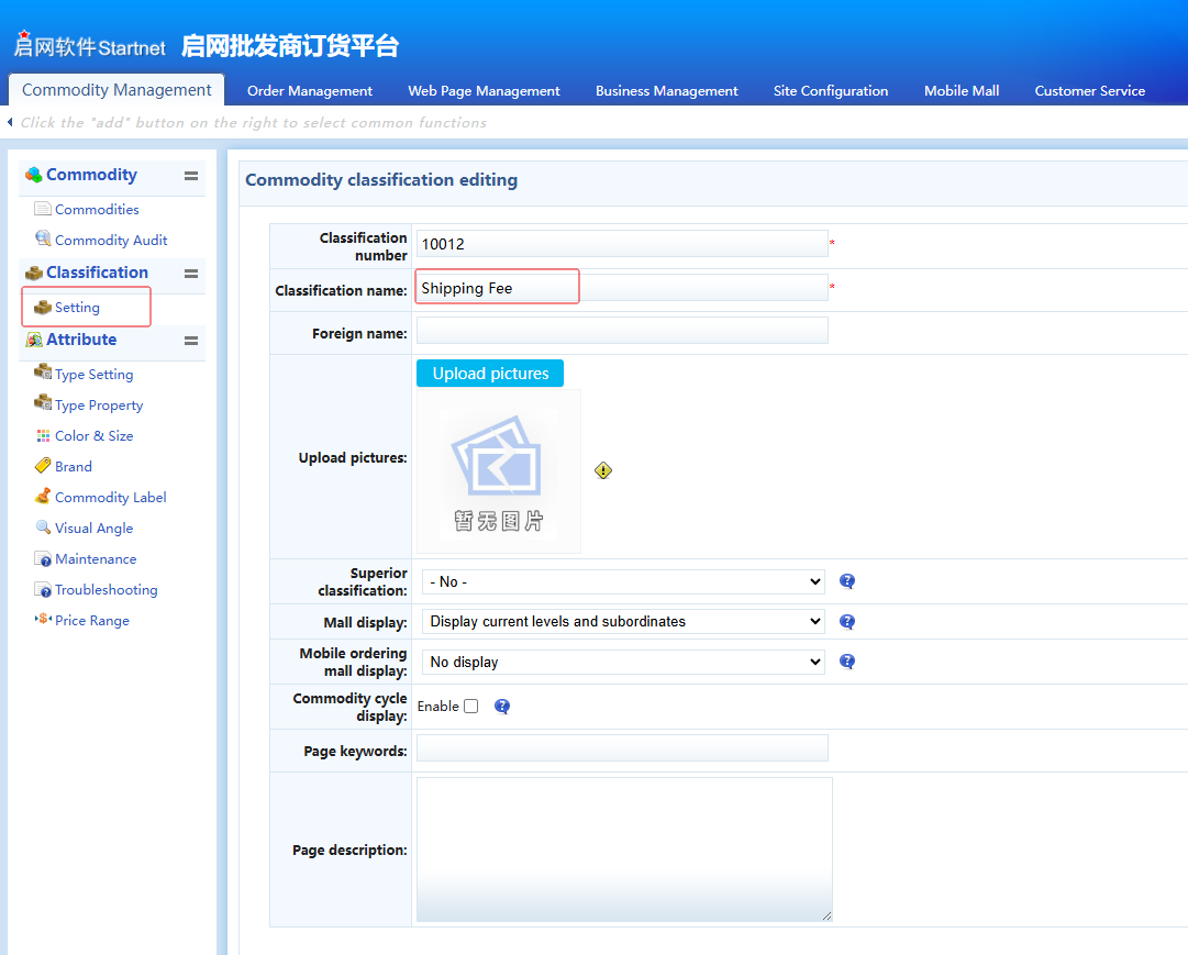 1. Go to "Product Management" > "Product Category Settings", and add a product category named "Shipping Fee". Other fields can use default values, as shown in Figure 1.