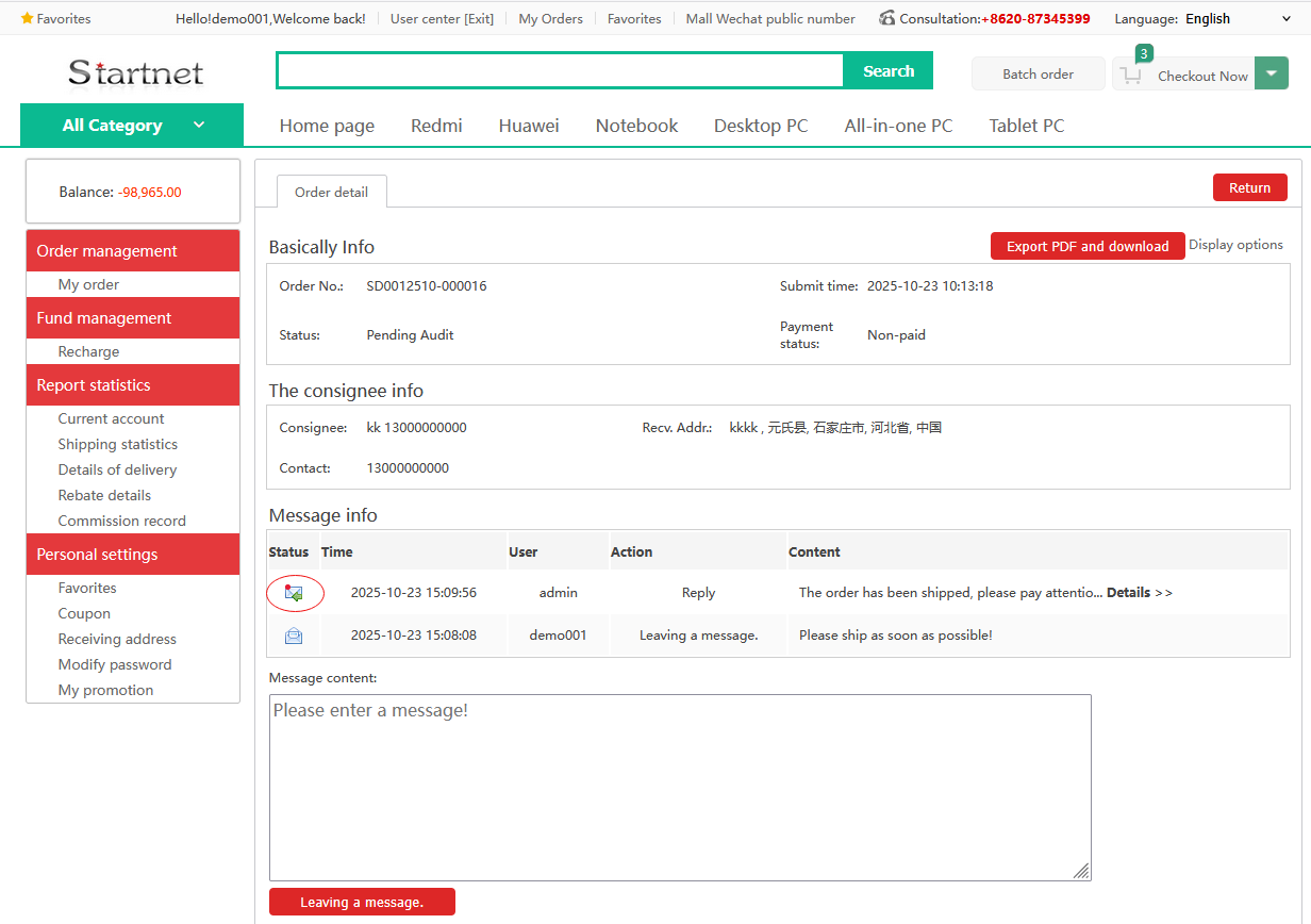 After the message is successfully sent, the merchant can receive the message. For details, please refer to the following Mall Order Messages.
