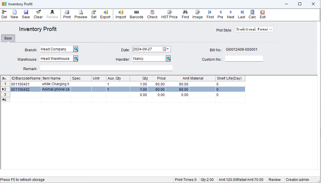 Click " Inventory Management " - " Inventory Profit Order " menu, and the following figure will pop up: