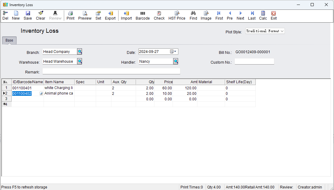 The inventory loss order is processed because the physical quantity is less than the book quantity and the book quantity needs to be reduced. The inventory loss order can be generated from the inventory table. For details, please refer to the inventory loss order generated from the inventory table. You can also directly add and input.
