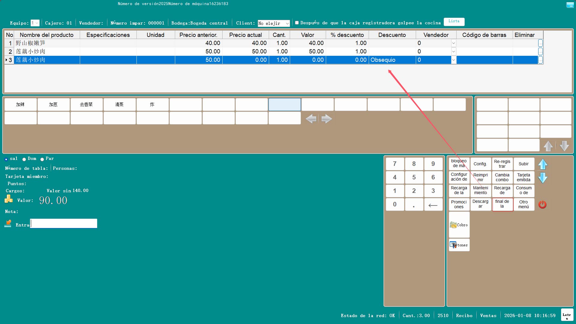 5. El área inferior derecha es la zona de botones funcionales, donde se puede navegar a través de las páginas utilizando las flechas arriba y abajo. A continuación se muestra un ejemplo de uso de la función de regalo: