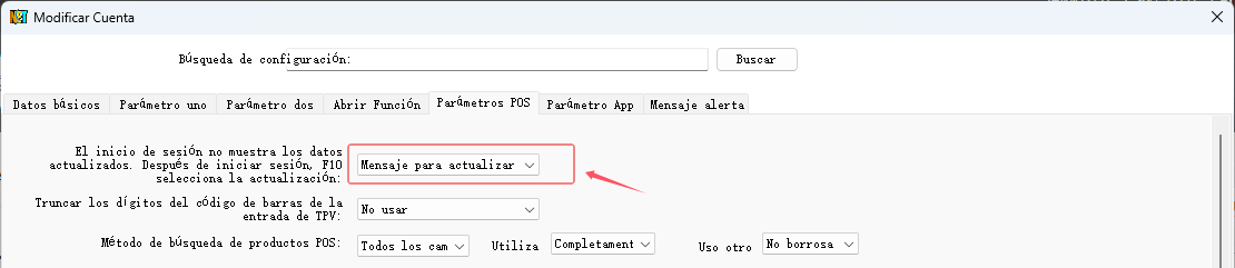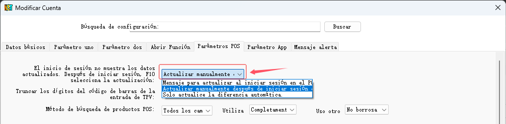 1. Seleccione la opción "Actualizar manualmente después de iniciar sesión en el POS" en el parámetro "Parámetros del POS" - "Actualizar Método de Información Básica" en el servidor, como se muestra en la siguiente figura: