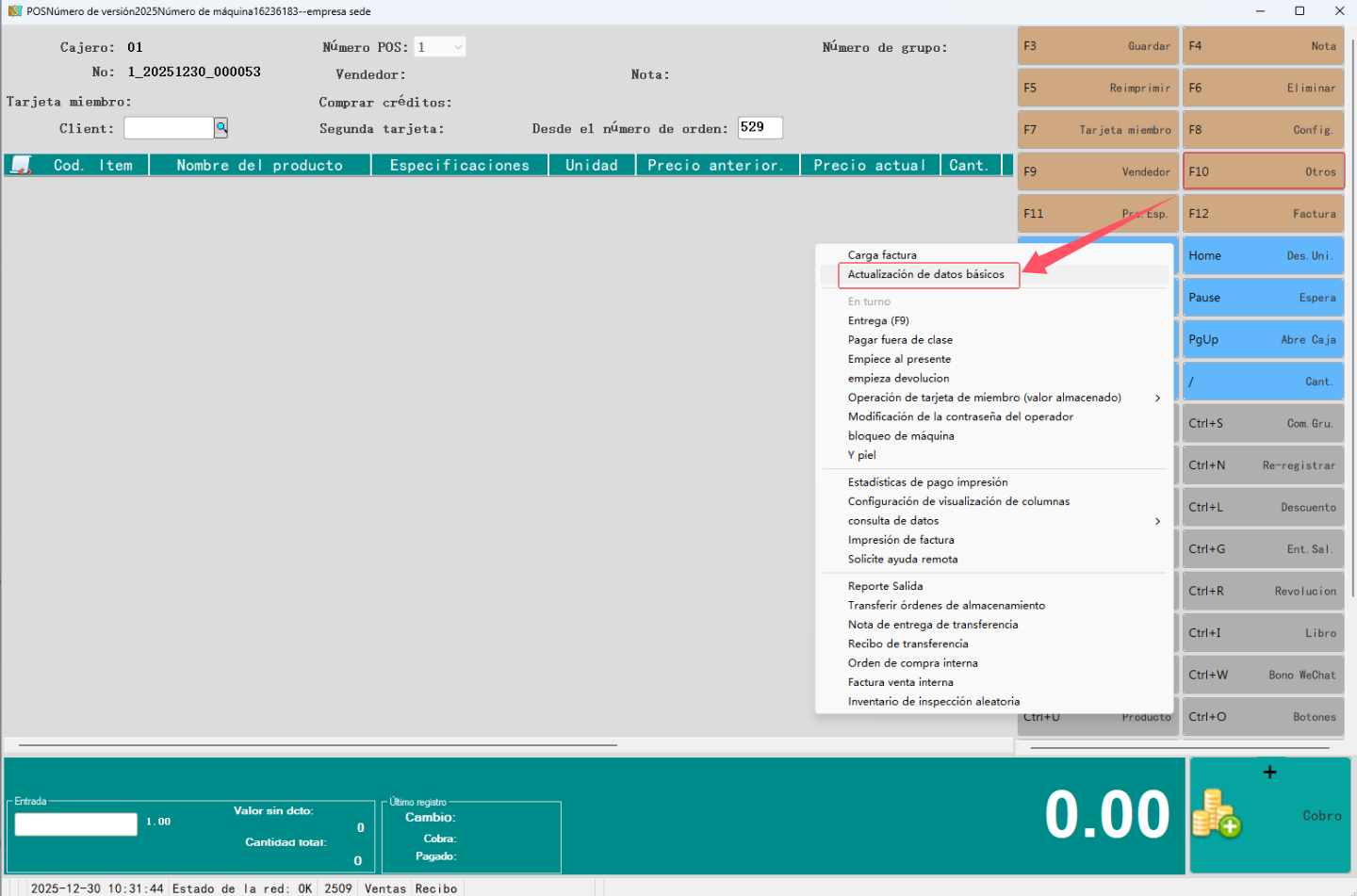 2. Abra el POS, haga clic en el botón "Otro" (F10) y seleccione el menú "Actualización de información básica" para actualizar manualmente la información básica de los productos, como se muestra en la siguiente figura:
