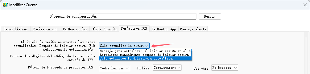 Seleccione la opción "Actualizar automáticamente las diferencias después de iniciar sesión en el POS" en el parámetro "Parámetros del POS" - "Actualizar Método de Información Básica" en el servidor, como se muestra en la siguiente figura: