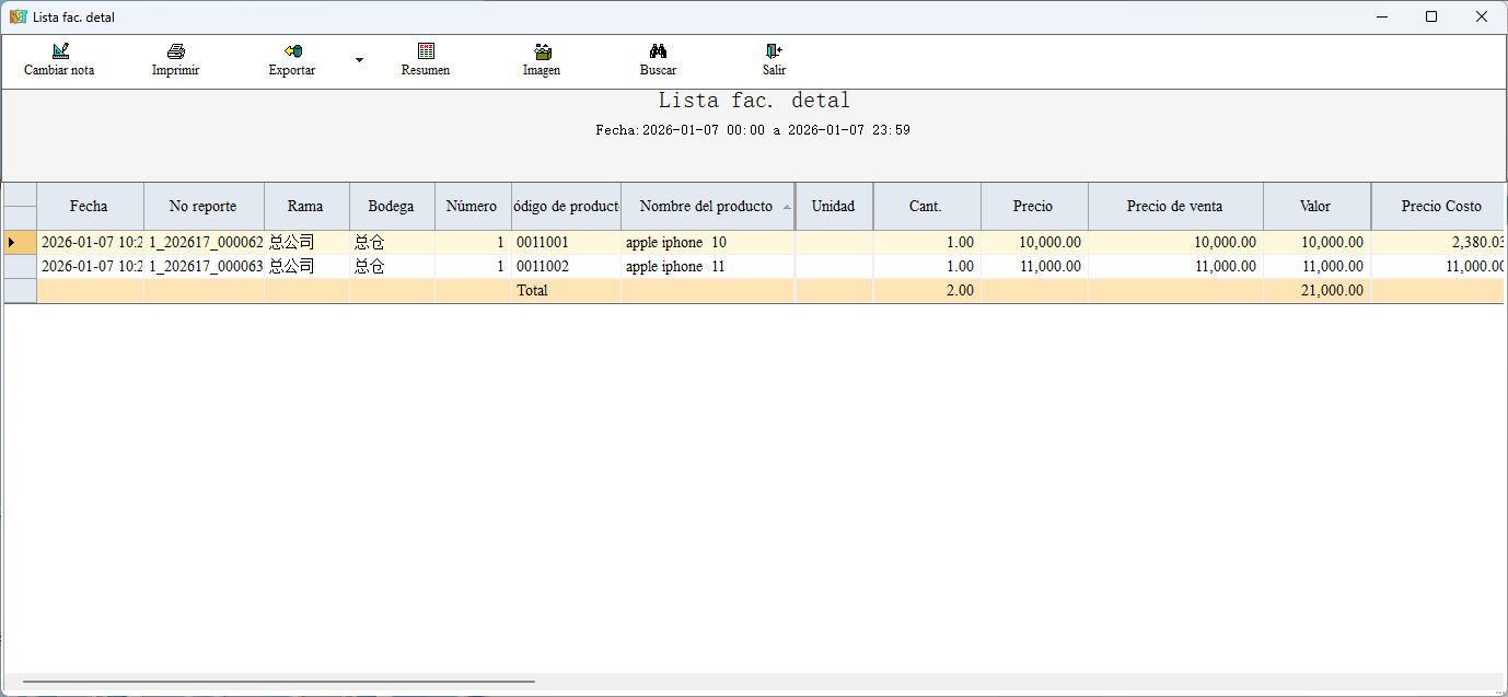 Nota: Todos los informes se pueden exportar a Excel. Para imprimir, ajuste el diseño de la página según el ancho de la impresora de recibos.