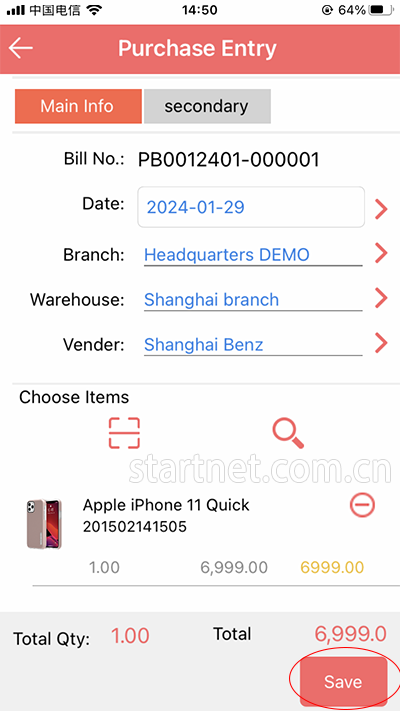 1. Click on the purchase receipt order in the main interface, as shown in the following figure: