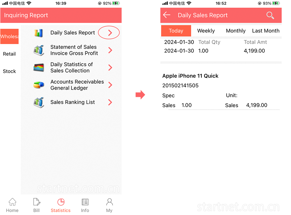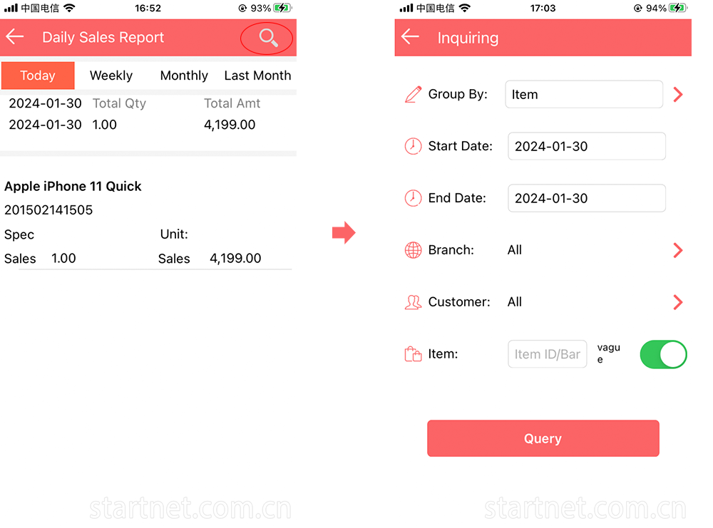 Can query reports on wholesale, retail, inventory, and other aspects. Taking the sales day report as an example, as shown in the following figure:
