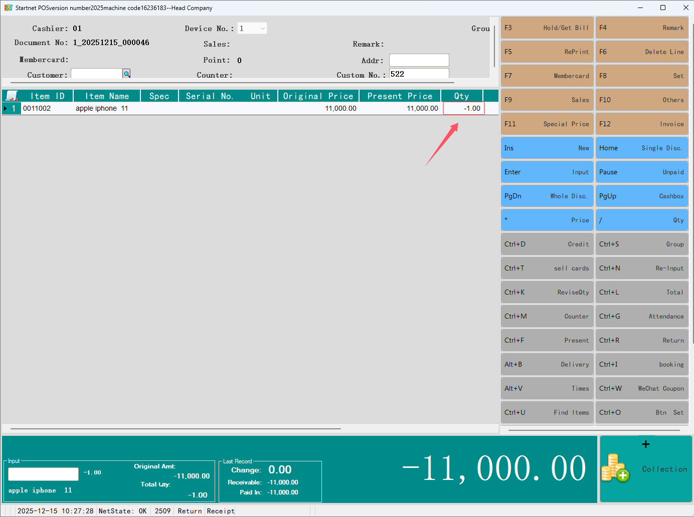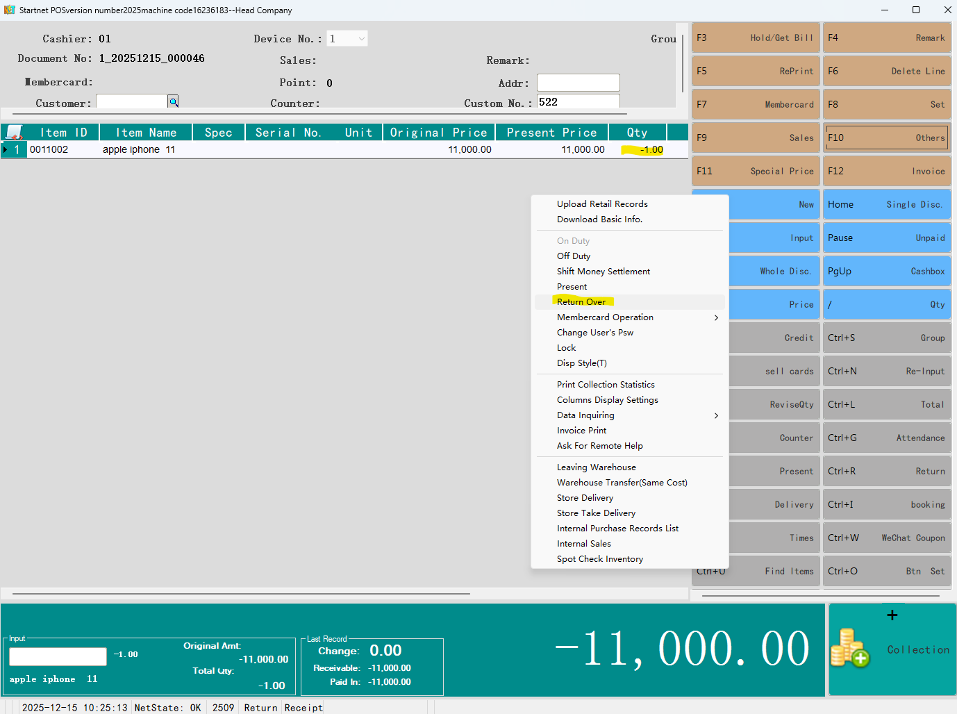 Return process: Select "Other" - "Start Return" on the POS main interface, and enter all items as negative numbers (return). Click "Other" - "End Return", the system generates a negative number document, and the return is successful.