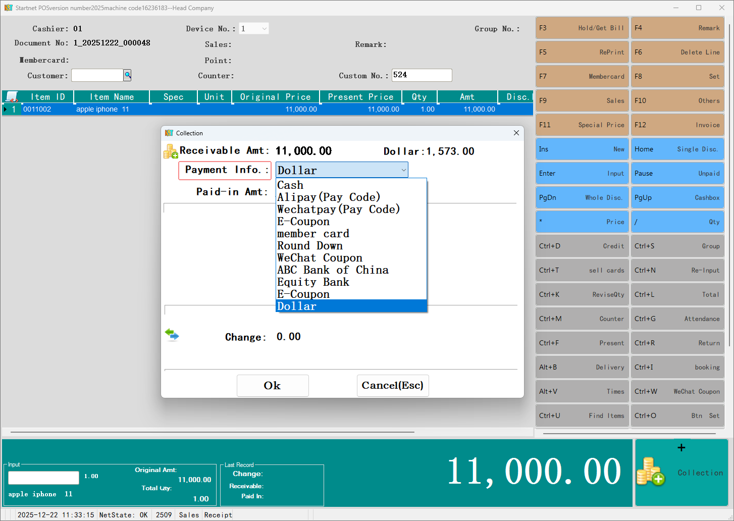 2. After opening the POS front desk, select the set foreign currency for payment, as shown in the following figure: