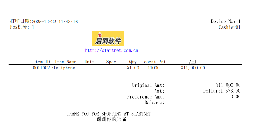3. To print receipts, go to the "Retail Backend" - "POS Parameter Settings" ->"Receipt Printing" menu, select "EXCEL Format" for receipt format, and the effect is shown in the following figure: