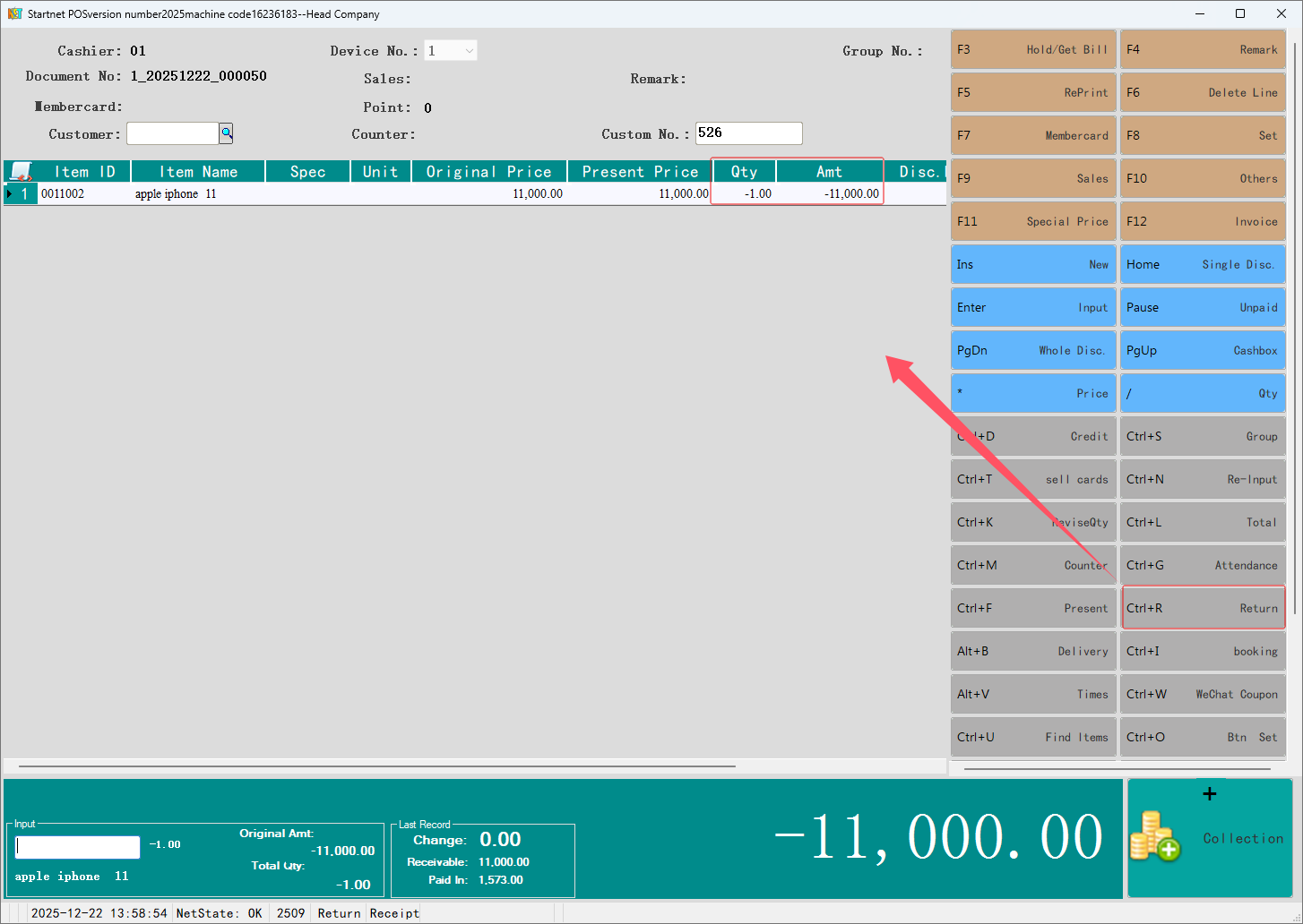 Return operation process: The cashier uses barcode scanning or manually inputs the product number that needs to be returned, clicks the "Return (Ctrl+R)" button, and both the quantity and amount will become negative. Select the refund method and confirm the amount, make a negative payment, print the return order, have the customer sign and confirm, refund the customer's amount, and complete the return. The system automatically generates a return record, and the accounting records are adjusted accordingly.